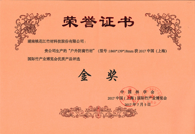 湖南桃花江竹材科技股份有限公司生產(chǎn)的戶外防腐竹地板在2017年7月中國(上海)國際竹產(chǎn)業(yè)博覽會中榮獲金獎,該獎項由中國林學會、中國(上海)國際竹產(chǎn)業(yè)博覽會頒發(fā)。湖南桃花江竹材科技作為中國竹材領域高炭防腐技術的發(fā)明人,在中國竹材領域有著舉足輕重的地位。湖南桃花江竹材科技一直專注與于竹材的戶外運用研發(fā)與創(chuàng)新,為全球客戶提供高品質(zhì)竹材。